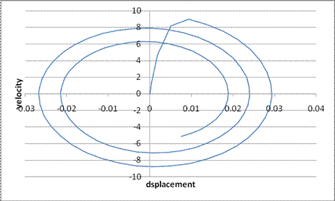 | Figure 11 is a classic state space plot where the important variables displacement and velocity are plotted. For an undamped solution the curve would be a single circle if the velocity axis is scaled by wn. Again, curve needs more interpretation. |